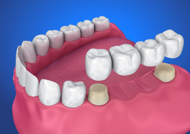 Crowns and bridges are dental prosthetics used to replace missing or damaged teeth. Crowns cover the entire tooth, while bridges replace one or more missing teeth by anchoring to neighboring teeth or dental implants.